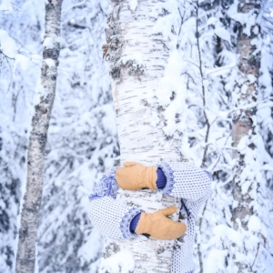 Kosketus on meille ihmisille äärimmäisen tärkeää, ja korona-aikaan siitä on saattanut olla joillekin pulaa, kun edes ystäviä ei ole saanut halata. Puu voi toimia ainakin jonkinlaisena korvikkeena halattavalle ystävälle, sillä puita on kaikkialla ja niiden halaaminen on turvallista. Anna iso halaus vaikkapa auringossa lämpimäksi ehtineelle hopeiselle kelolle ja paina samalla poskesi ja korvasi puun sileää kylkeä vasten. Tunne puun lämpö! Halatessa puita kannattaa ajatella hieman tarkemminkin. Mitähän kaikkea ne ovat elonsa aikana nähneet?